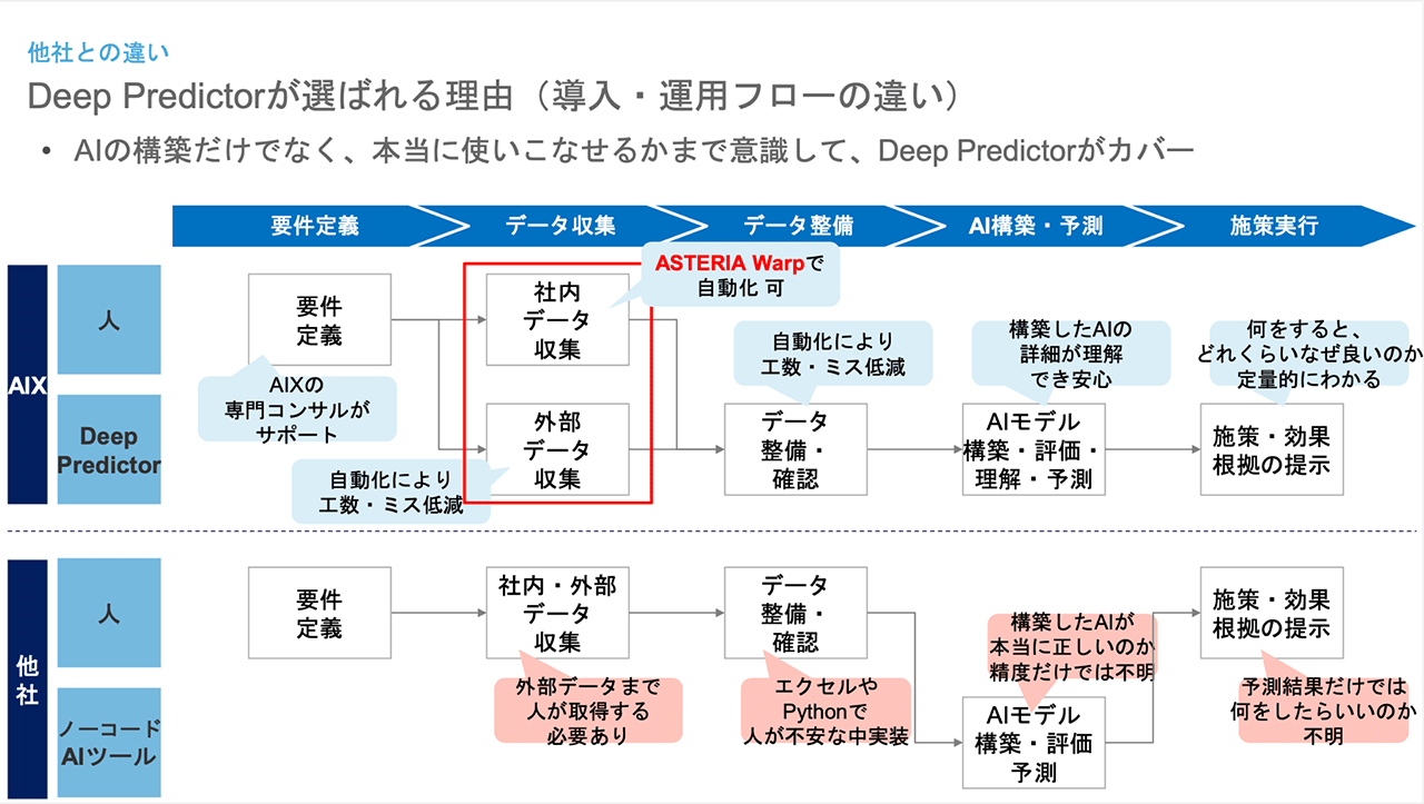 単なるAIの構築だけではなく、本当にAIをビジネスに活用するまでの領域をDeep Predictorがカバーしていますので、使いこなせなかったということがなく安心してご利用いただけます。また、ASTERIA Warpを組み合わせることで、社内外のデータを収集する工程を自動化することも可能です。
