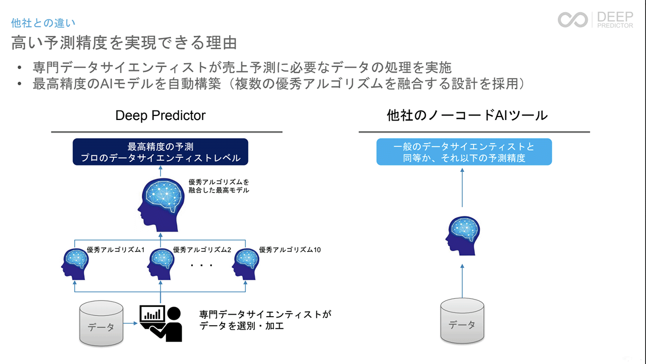 高い精度を実現するには、アルゴリズムと学習データの作り込みが肝要です。Deep Predictorでは、世界でも優秀なアルゴリズムをもとに、お客様のデータに合わせたアルゴリズムを開発するため、高い精度で予測を行うことができるようになっています。また、お客様の保有データの加工も当社のデータサイエンティストが一緒に作り込みを行います。これら2つを組み合わせて非常に高い精度を実現できています。