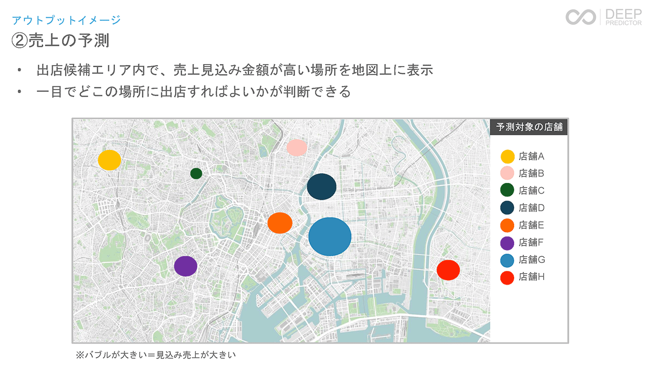 また、出店候補エリア内でどこに出店することで売上見込み金額が高くなるか予測した結果を数のように地図上に表示することも可能です(オプション)。