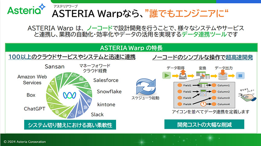 ASTERIA Warpの特長は、100種類を超えるクラウドサービスやシステムと簡単に連携することができることです。また、ノーコードツールであるため、アイコンを並べるような簡単な操作でデータ連携を実現することができるため、開発コストの大幅な削減につなげることができます。