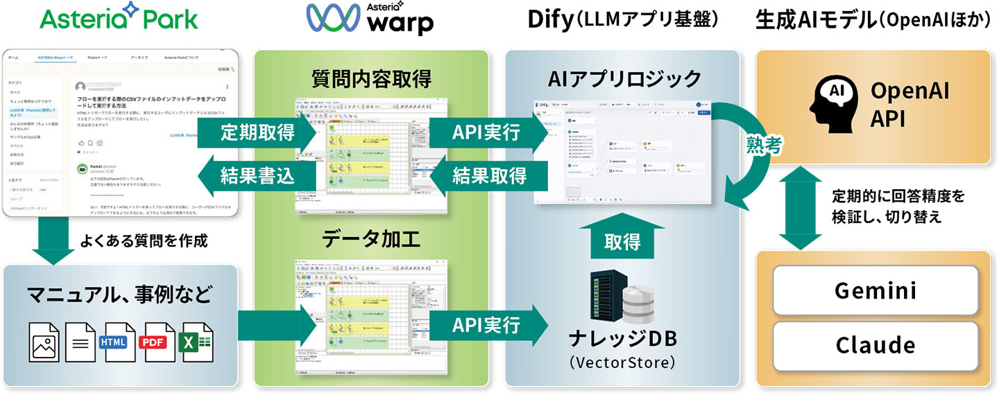 そこで今回、RAG(検索拡張生成)に対応したLLMアプリケーション開発基盤「Dify」を使い、AI回答システム「ParkAI」を構築しました。ASTERIA Warpを連携基盤として活用し、以下の流れを自動化しています。