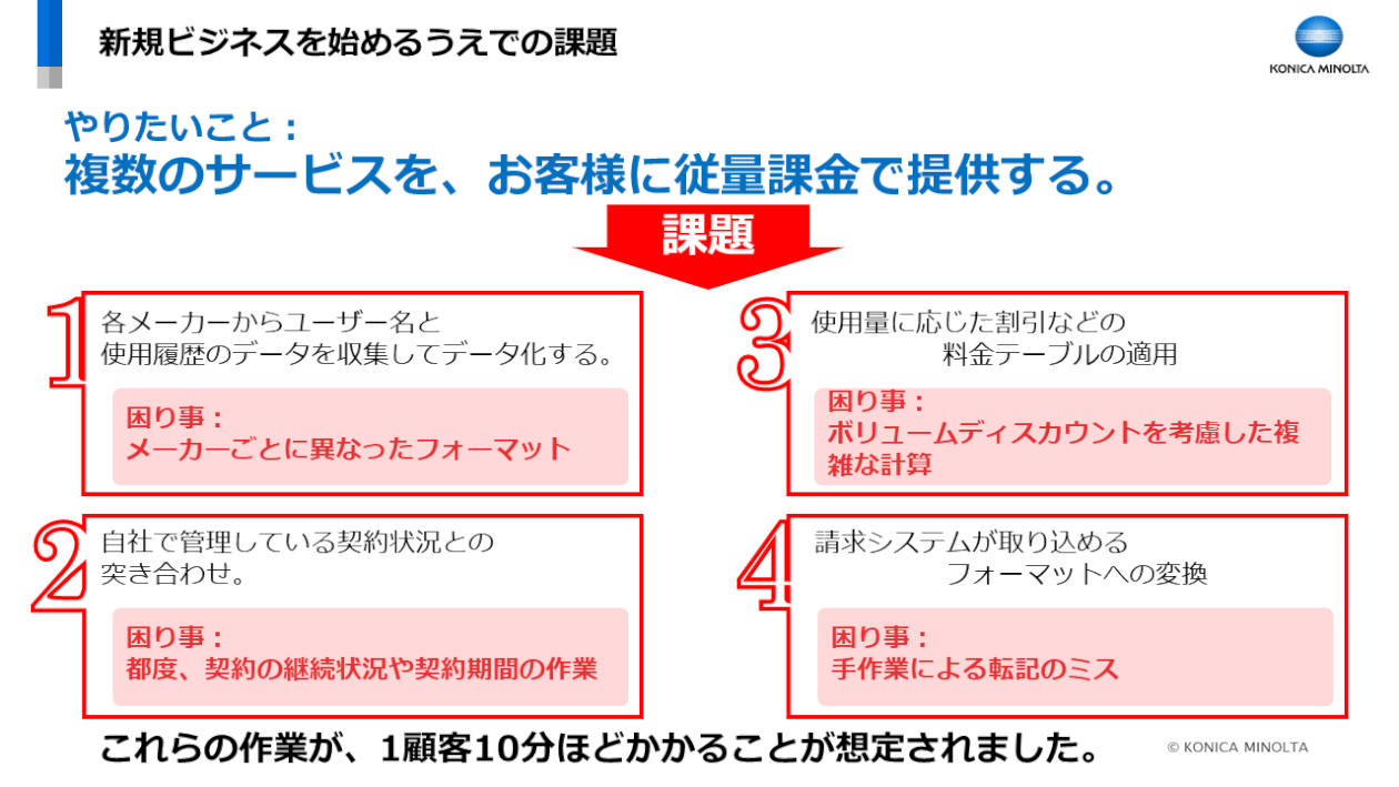 新規ビジネスは複数サービスを組み合わせて使用量に応じて従量課金で提供する形態であったため、毎月の請求額計算をExcelで行うと作業工程が煩雑になることが予想されました。具体的には、多様なデータフォーマットの取り扱いや複雑な集計処理など、上図の4点を課題と感じており、また、人為ミスを防止するためにも自動化できないか検討していました。