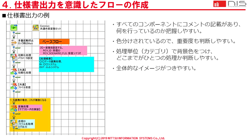 また「仕様書出力」機能を意識したフローの作成ポイントについても下記のスライドで解説いただきました。